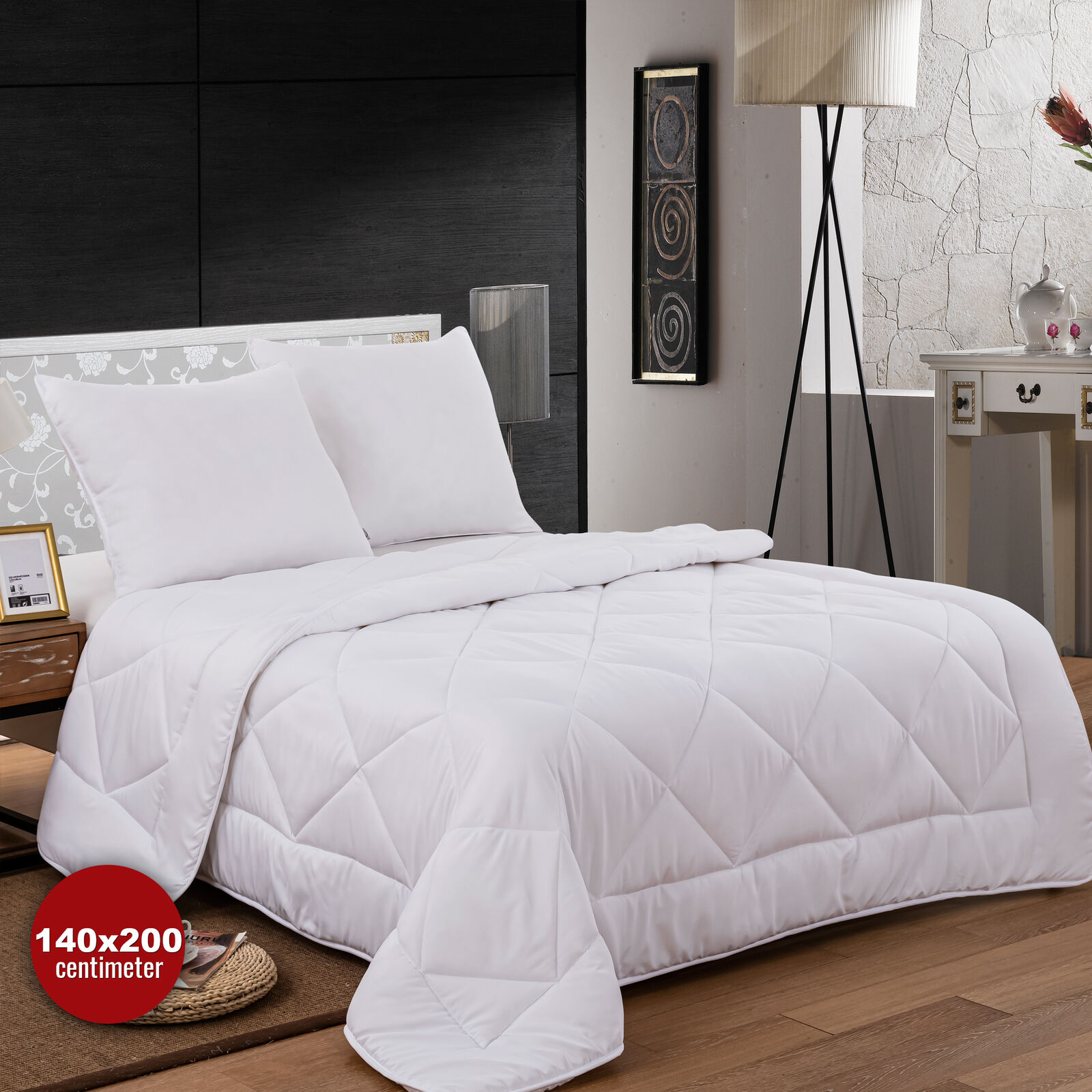 Weiße Bettdecke und Kissen aus Mikrofaser