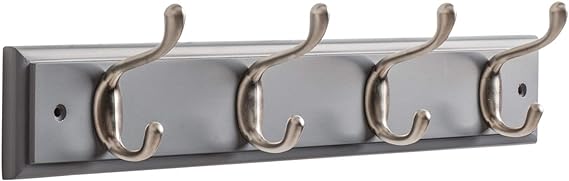 • PRAKTISCH, SICHER UND STARK – Dieser Hut- und Kleiderhaken mit festem, klassischem Stil verfügt über strapazierfähige Haken in gebürstetem Nickel-Finish, die auf einem traditionellen taubengrauen Holzbrett angebracht sind.